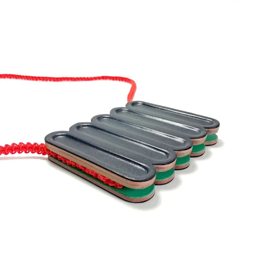 Marcus Scholz 在墨爾本街頭漫步時拍攝的一系列意外和故意的多重曝光膠片照片充滿了色彩和扭曲的建筑細節。這些獨特的照片讓 Blanche 走上了抽象和轉化的道路,這些獨特的照片被用作一套由彩色和透明硼硅酸鹽玻璃、陽極氧化鈦和銀組合制成的項鏈的起點。
