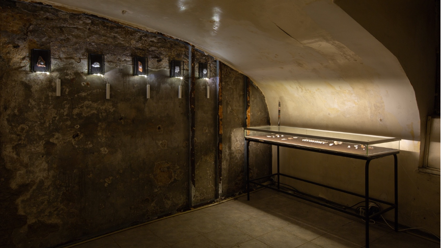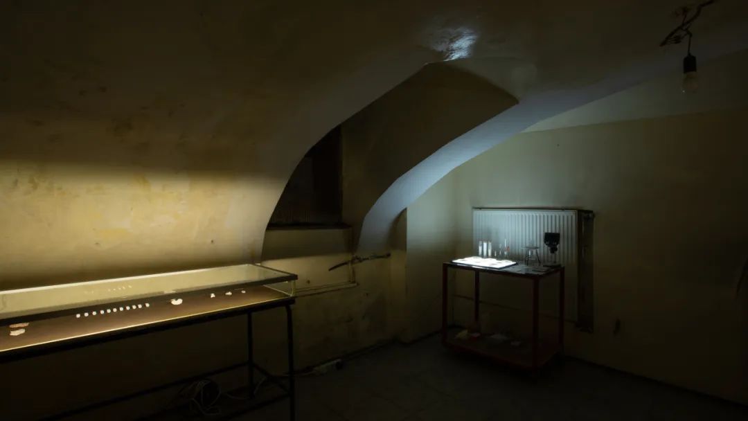 A:展覽布置花費了很多心思,因為我選的是地窖,給我提供了很大的展覽空間,但那只有一盞燈,十分昏暗。于是我決定干脆就全都暗下來,只照亮作品。一部分“考古碎片”陳列在玻璃桌里,也特意為一部分“保存完好的文物”制作了燈光展示盒,懸掛在墻上。引導觀眾的視線,也給整個空間營造了比較神秘的氛圍。