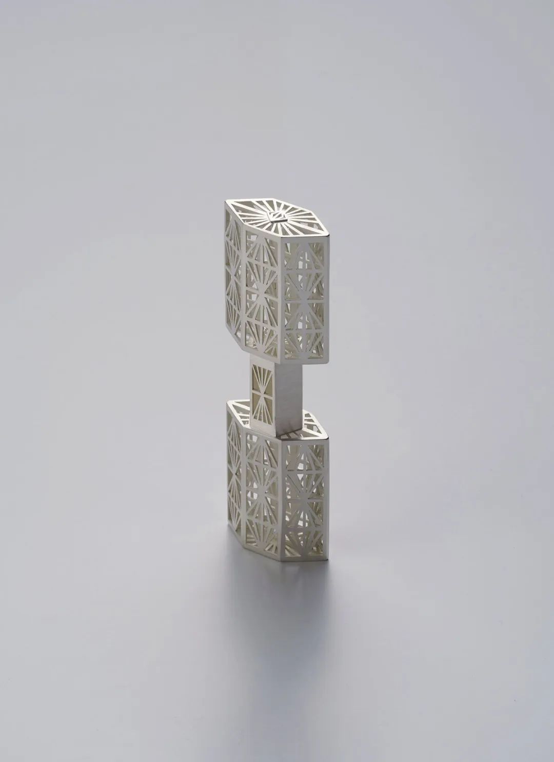 她的作品主要以自由塊體的形狀作為物體,裝飾是次要元素,可以充分表達吊墜、胸針或各種功能。這是基于她純潔的童年。她通過創造一個規則而穩定的六角形結構的虛擬空間,研究了在現代人焦慮的心靈中追求所需的穩定和幸福的意義的作品。作品的主要形態是她童年記憶的圖像以及在結構中重新發現的圖像。