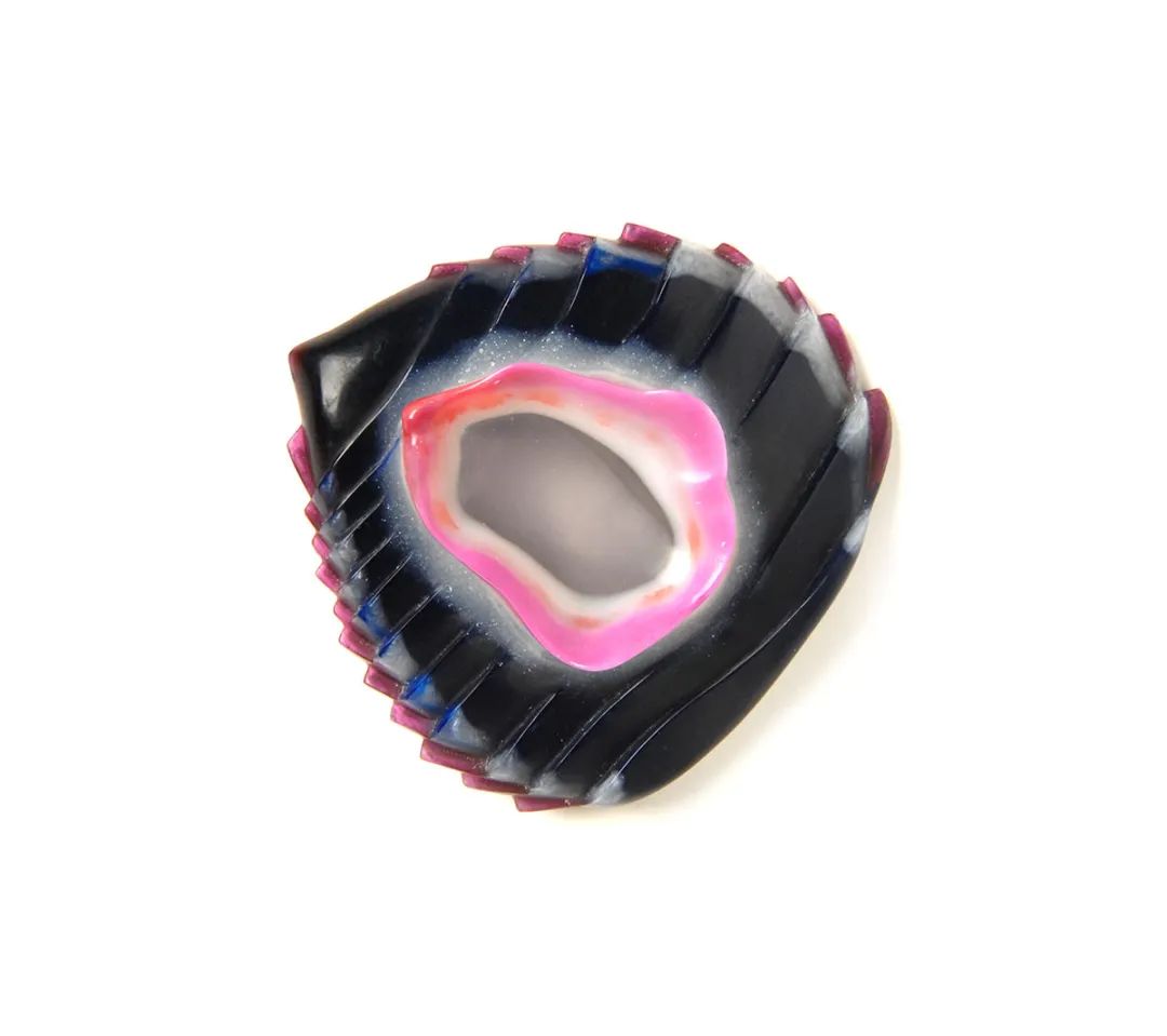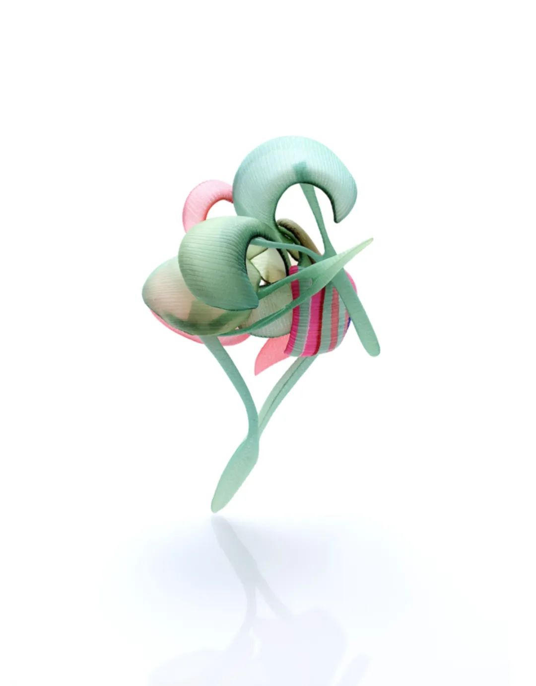 展覽展出了 Jennifer Merchant、Emiko Oye 和 Nikki Couppee 三位藝術家的作品,他們將塑料變成了可穿戴的藝術品。塑料無疑是我們日常生活的一部分,也是經常被忽視的珠寶材料。但這種從普通到壯觀的轉變提出了一個問題:我們如何賦予物品價值?什么是珍貴的?每位藝術家都有自己獨特的方式來解釋這些問題,并通過利用直覺重新改造材料,而顏色仍然是作品的關鍵組成部分。