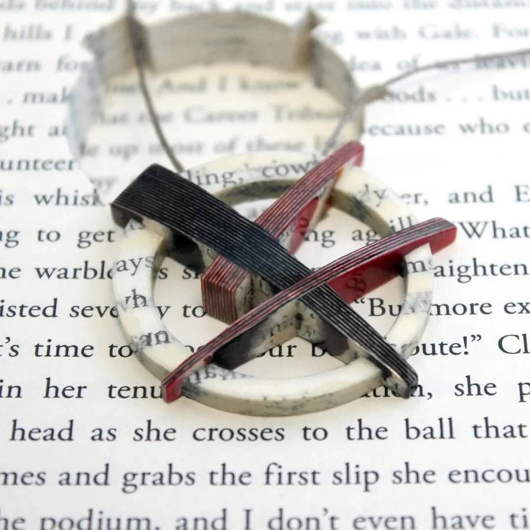 Jeremy 從當(dāng)?shù)氐呐f貨店購(gòu)置書籍,從書中挖出自己需要的部分與形狀,然后把數(shù)百層紙壓縮在一起,使用特殊的覆膜技術(shù),刷上高光澤涂層并打磨拋光。對(duì)于每件作品,Jeremy都會(huì)從經(jīng)典的書籍中選出一句獨(dú)特的語(yǔ)錄,通過首飾的形式來敘述書中的故事。