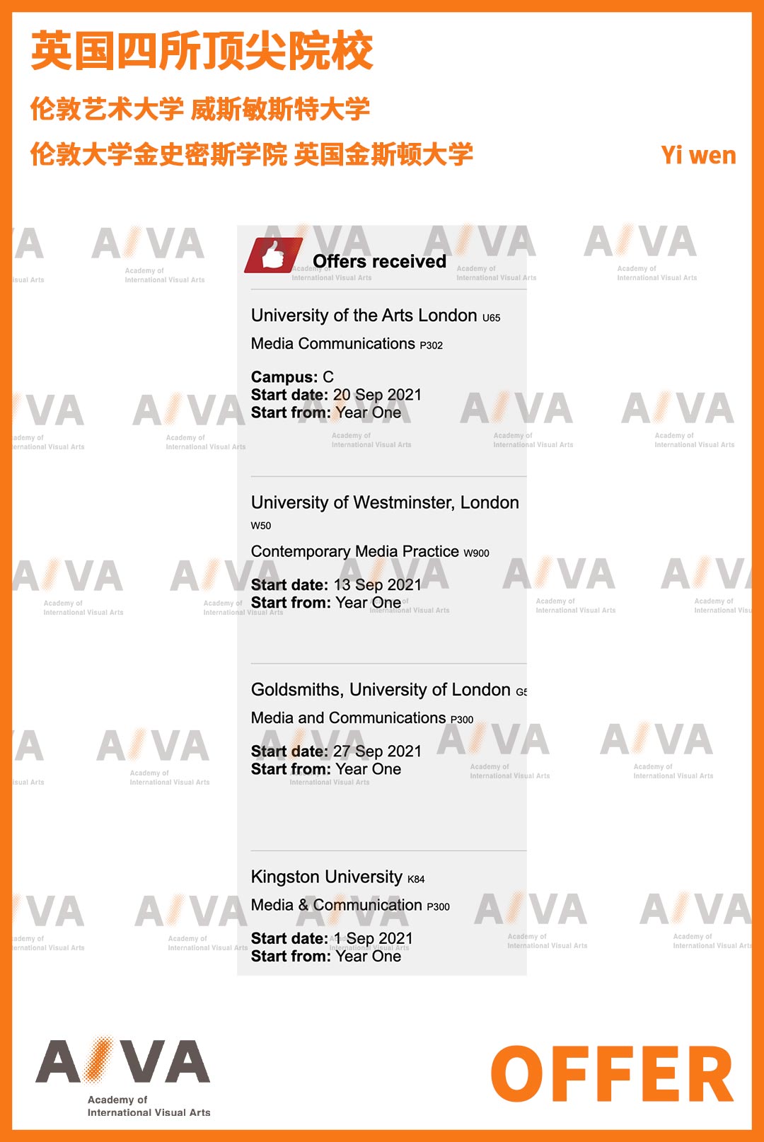 在今年的申請季中,AIVA的Yvonne同學憑借高質(zhì)量的作品集及優(yōu)異的學術成績,成功斬獲紐約大學Tisch藝術學院的本科錄取,同時還收獲了包括UAL、威敏、金匠、金斯頓、艾默生學院等多所頂尖英美院校大滿貫!(此處掌聲安排)