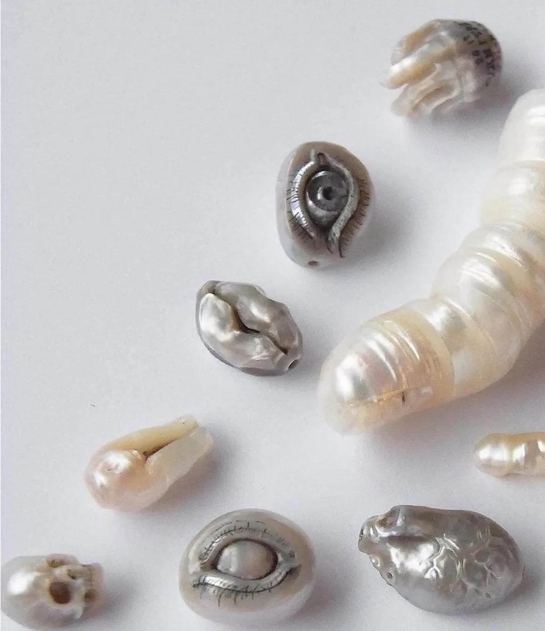 Shinji Nakaba 是一位當(dāng)代日本首飾人,他用礦物、貝殼、珍珠和鋼鐵以及回收的鋁罐和塑料瓶呈現(xiàn)自然主義但隱晦的圖像。Nakaba使用古老的工藝雕刻寶石、貝殼和珍珠。但是他的項鏈、胸針和戒指看起來一點也不傳統(tǒng),盡管逼真的圖像被渲染得非常精確。面部以陡峭的角度出現(xiàn),與其他面孔或人物緊張地接觸;單獨(dú)的女性乳房或男性生殖器位于前面和中央;珍珠變成了令人毛骨悚然的頭骨或無形的頭顱。