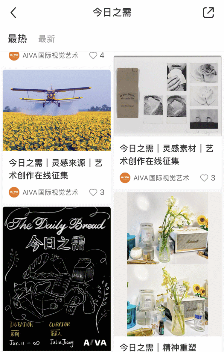 關(guān)注“aiva_visual_arts”IG賬號,點(diǎn)擊主頁置頂帖子,參與話題#今日之需 發(fā)布相關(guān)帖子。作品中包括參賽者姓名、作品名稱、簡短描述(中文100字/英文50字)。