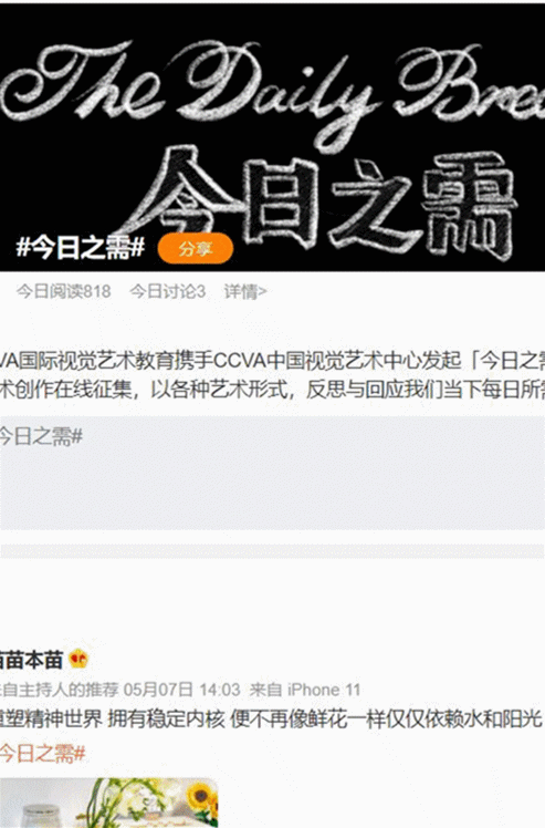 AIVA無限期線上展覽「今日之需」,自5月7日發(fā)起藝術(shù)創(chuàng)作在線征集后,在小紅書、微博、IG等平臺,收到來自世界各地藝術(shù)生、藝術(shù)家、藝術(shù)愛好者的積極投稿,大家以舞蹈、首飾、攝影、速寫等形式表達(dá)屬于自己的#今日之需#。