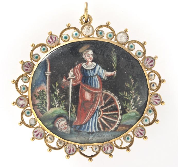 殉道者圣凱瑟琳吊墜,無名制作,17世紀(jì),西班牙、黃金、琺瑯。