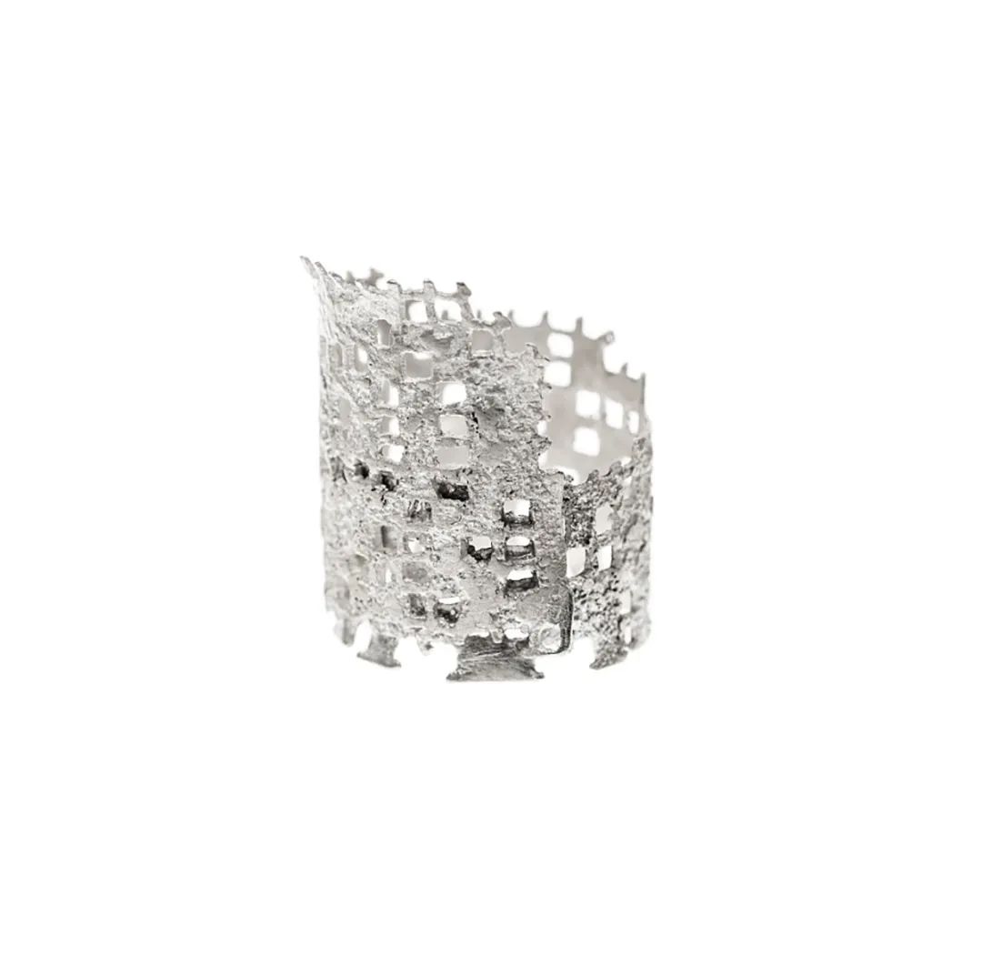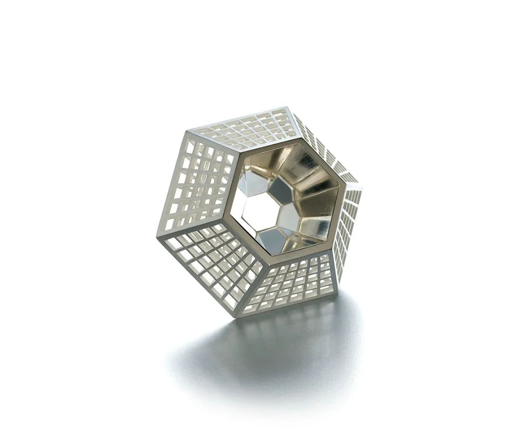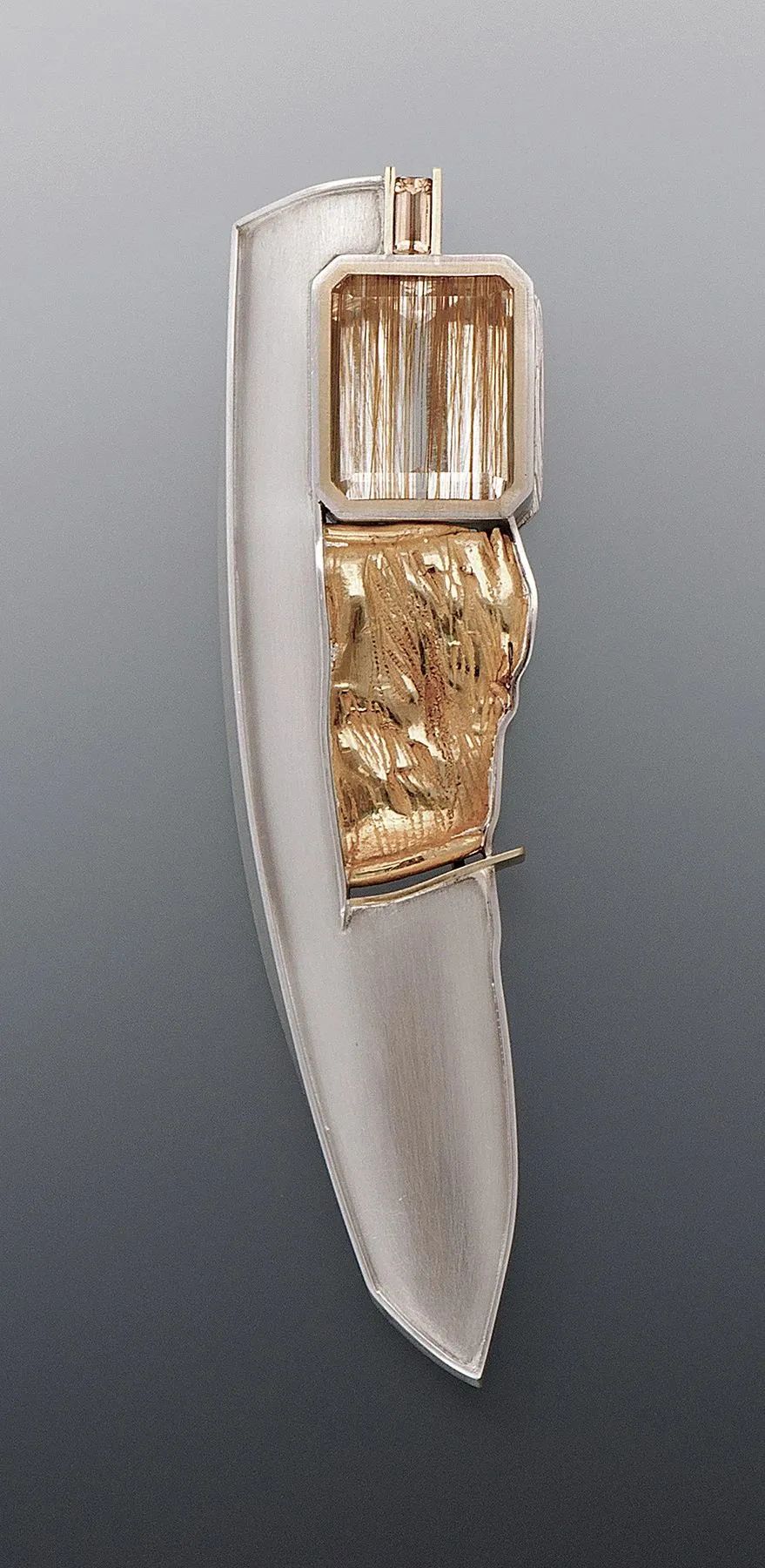 無(wú)論靈感是來(lái)源于風(fēng)景,還是建筑,或兩者兼而有之,金屬匠 Eleanor Moty 創(chuàng)造出的獨(dú)特首飾,詩(shī)意地圍繞著佩戴者和觀眾。Moty 在 1960 年代和 1970 年代憑借在裝飾中使用了尖端的制造技術(shù),例如電鍍和光刻,首次獲得認(rèn)可。在過(guò)去幾十年中,她將重點(diǎn)轉(zhuǎn)向在作品中加入寶石,她創(chuàng)作的大型胸針體現(xiàn)了與石英石“線性圖像”的對(duì)話。