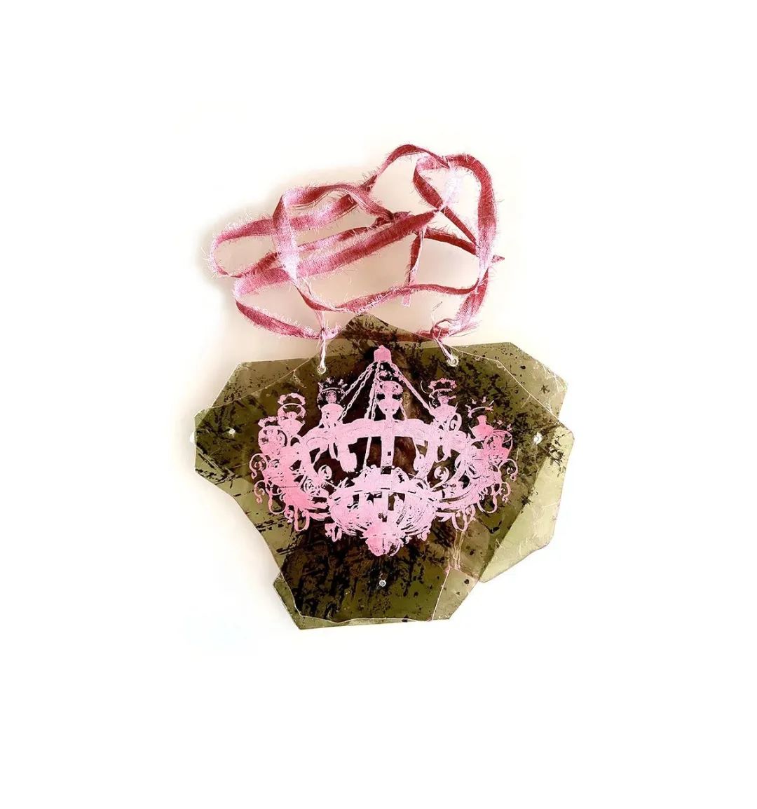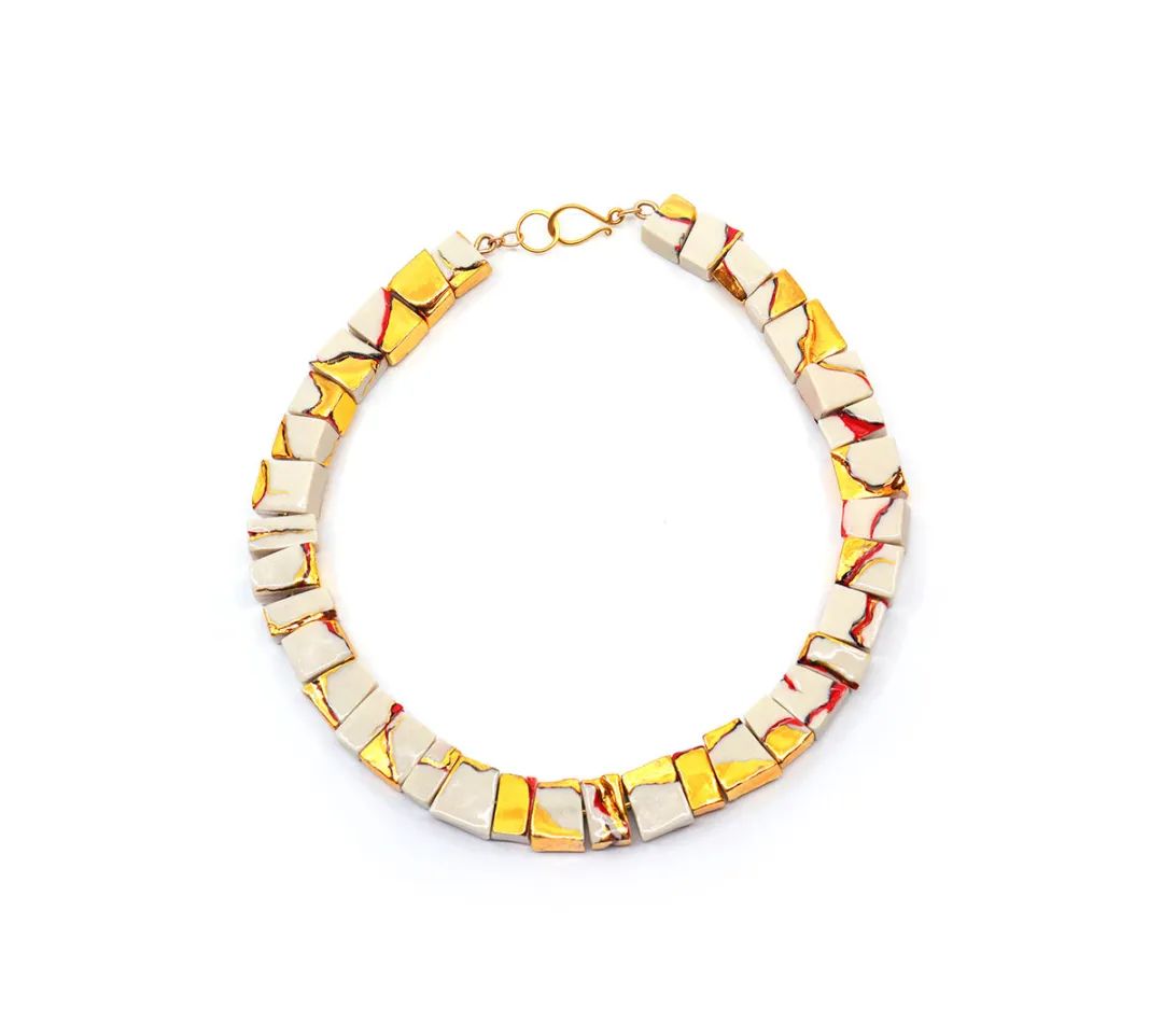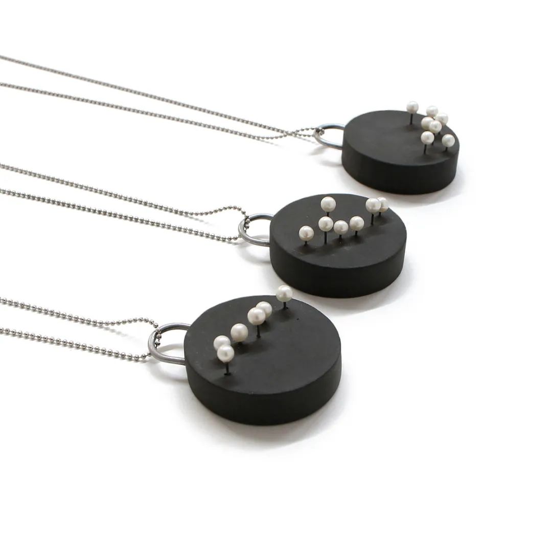 Tinted high-fire porcelain, nichrome wire, pearls, cotton string
