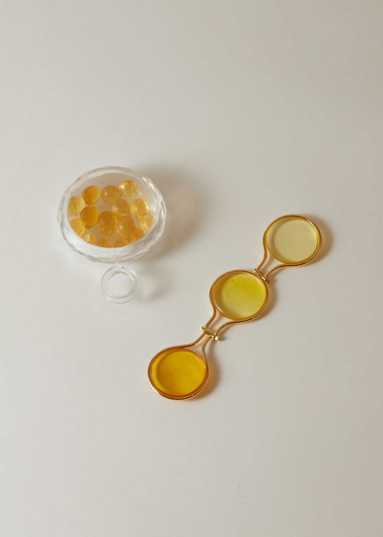 In the <Warmth> series, I become lost in thought when I see the warm yellow tone, feeling very warm, and the longer I look, the blurrier my vision becomes. I find this feeling very fascinating, so I wanted to express it through a series of accessory works that transform glasses. The halo of the sun gave me inspiration, with three different colours from light to dark. Therefore, I used UV glue as the main material for the product. The transparent and translucent properties of UV glue effectively express the concept I want to convey.