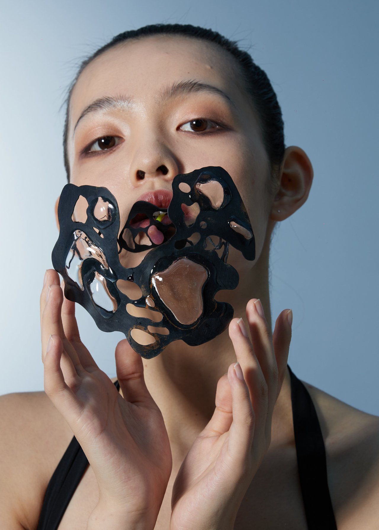 在作品《窒息感》中,以海牛因為海藻的泛濫而缺氧為靈感,我嘗試加入了有關(guān)海藻本身的材料去融入作品,比如海藻酸鈉。作品都是圍繞著面部去展開。因為環(huán)境和海洋的污染本質(zhì)上人為因素占比更多,所以我想讓佩戴者感同身受海牛的處境。作品利用泡泡膠這一材料,結(jié)合封固在人面部的網(wǎng)狀框架,讓人們從視覺感受到想呼吸卻被外面的框架給阻擋住的痛苦。將金屬氧化成黑色,既想從視覺上讓佩戴者感受到缺氧帶來的痛苦,并且能突出海洋生物在海洋中的絕望。