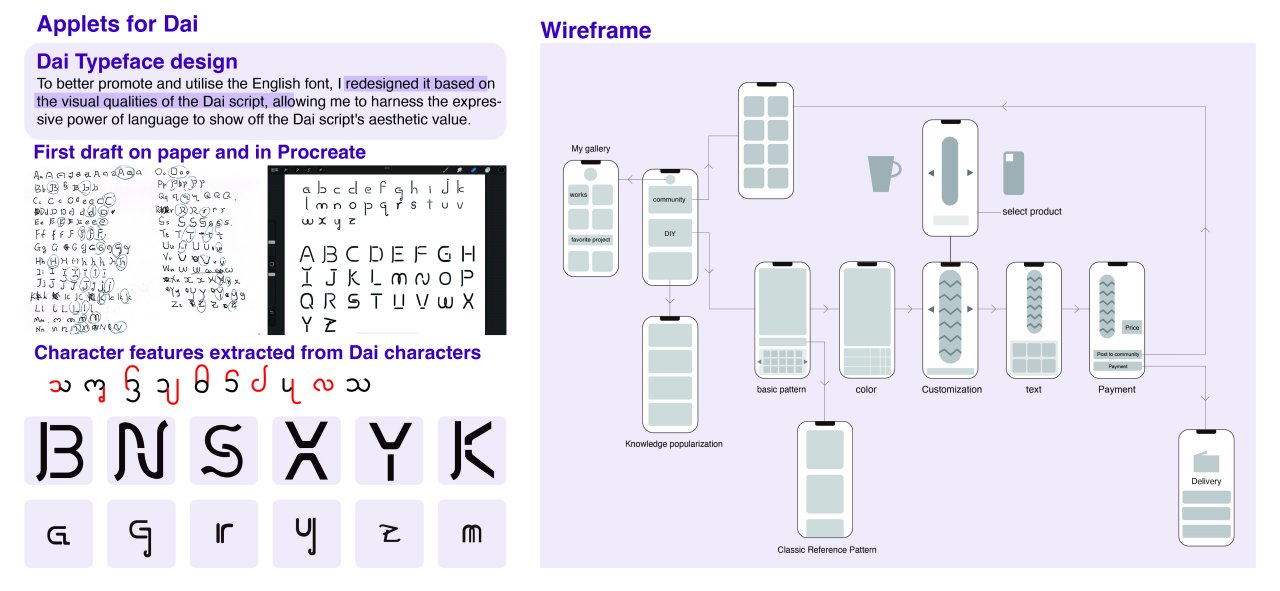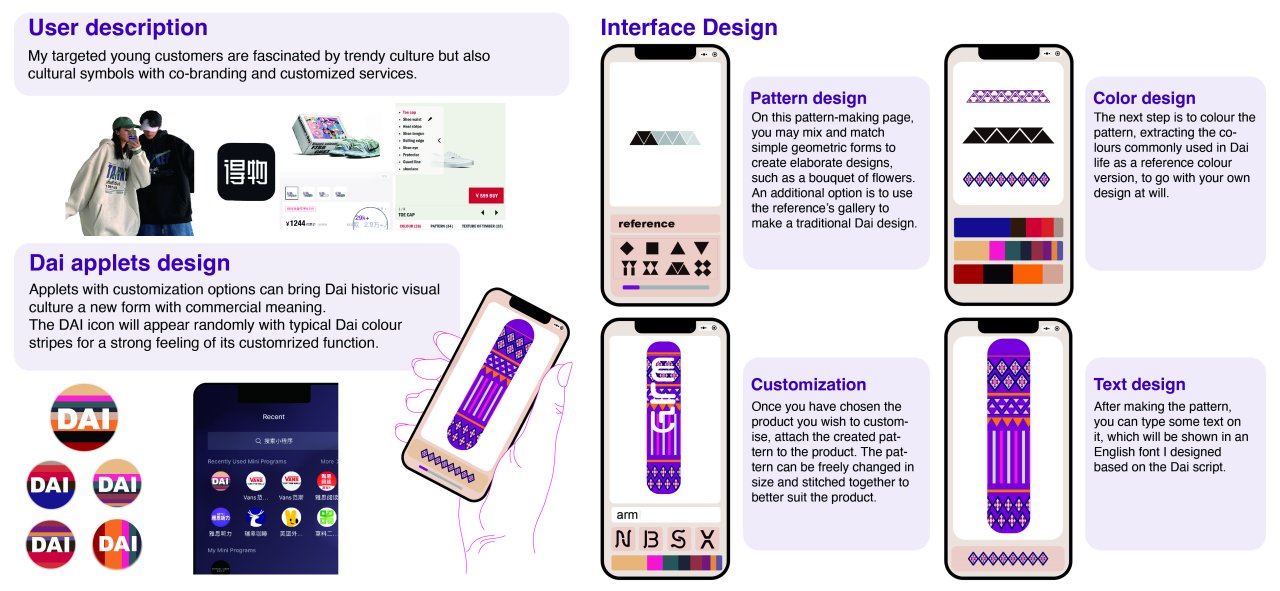 As an ethnic minority, I am very concerned about my own culture. In my project <Dai Applet> I combine Dai culture with developed design culture and technology to promote the linkage between my culture and trendy products through electronic platforms such as applets. I try to integrate the visual symbols of traditional culture into today's public aesthetics and give a new lease of life to the traditional culture of ethnic minorities. <Mask Redesign> is based on the background of daily life where people gradually accept wearing masks under the influence of global epidemics. I hope to expand the structure and function of the mask. In addition to providing protection, I hope to add a more aesthetic and personalized appearance to the mask and a more comfortable wearing experience. <Traffic Light Design> is a concept design for a traffic light system. The topic of traffic light systems becoming complex was discussed on Chinese social media last August. I designed a new form of traffic light system and conceptually imagined the future of traffic.