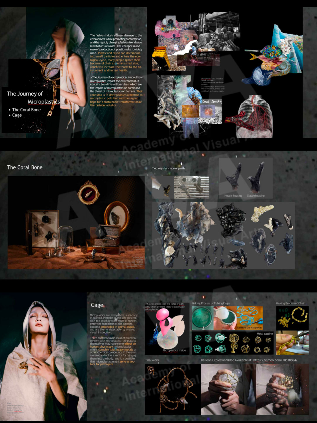 《微塑料之旅》項(xiàng)目有三個部分:珊瑚骨和籠和可降解材料研發(fā)。其作品核心思想是喚起人們對微塑料污染的關(guān)注以及對快時尚產(chǎn)業(yè)可持續(xù)轉(zhuǎn)型的迫切希望。當(dāng)下,微塑料污染是一個日益突出的問題,具有對環(huán)境和人類健康的潛在威脅。