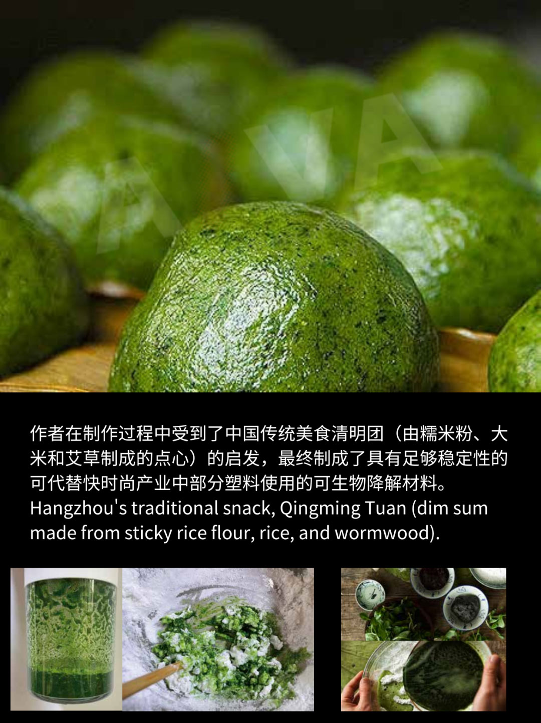 “我想做這個項(xiàng)目是基于現(xiàn)在快時尚產(chǎn)業(yè)產(chǎn)生的環(huán)境污染和資源浪費(fèi)。但是,由于目前限制快時尚產(chǎn)業(yè)發(fā)展是不太現(xiàn)實(shí)的,所以我想從我們配飾材料的角度出發(fā)來制作一些可降解的材料。”