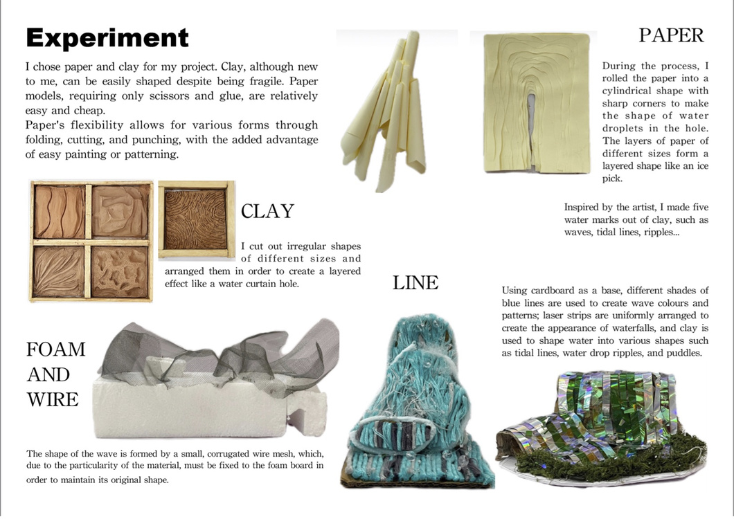 For the first project "Fluid Form ", I was inspired by four artists and started with materials, trying paper, clay, wire mesh and other materials. Place art installations in the lobby of the aquarium, and use large-scale buildings to occupy the main position, allowing visitors to better perceive the space.