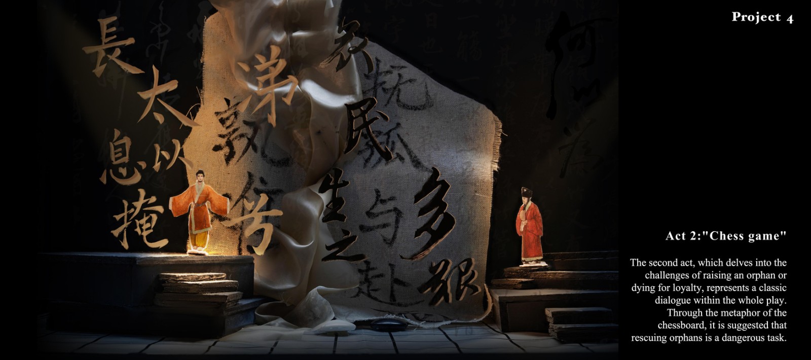 Orphan of Zhao marks the culmination of my learning experience. I enhanced the stage effects through projections and lighting, intensifying the tragic atmosphere. This traditional Chinese drama explores themes of loyalty, sacrifice, and justice, depicting a prolonged struggle against evil. The forces of justice, represented by the protagonist, exact a painful toll in their pursuit of revenge.