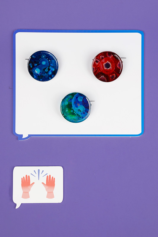 我嘗試打破傳統首飾只用金屬作為材料的規則。每件首飾的背后都是一場材料的探險。探索不同材料的可能性能夠讓不同的材料碰撞出不一樣的火花。例如,在《細胞》系列作品中,我運用樹脂作為主要材料,并且與丙烯、染色精、冷琺瑯、液體樹脂等結合,創造出奇妙的畫面效果。在我的作品《地圖》中,我用油性彩鉛在銅板上進行上色,這增強了圖像的色彩豐富性和畫面美感。