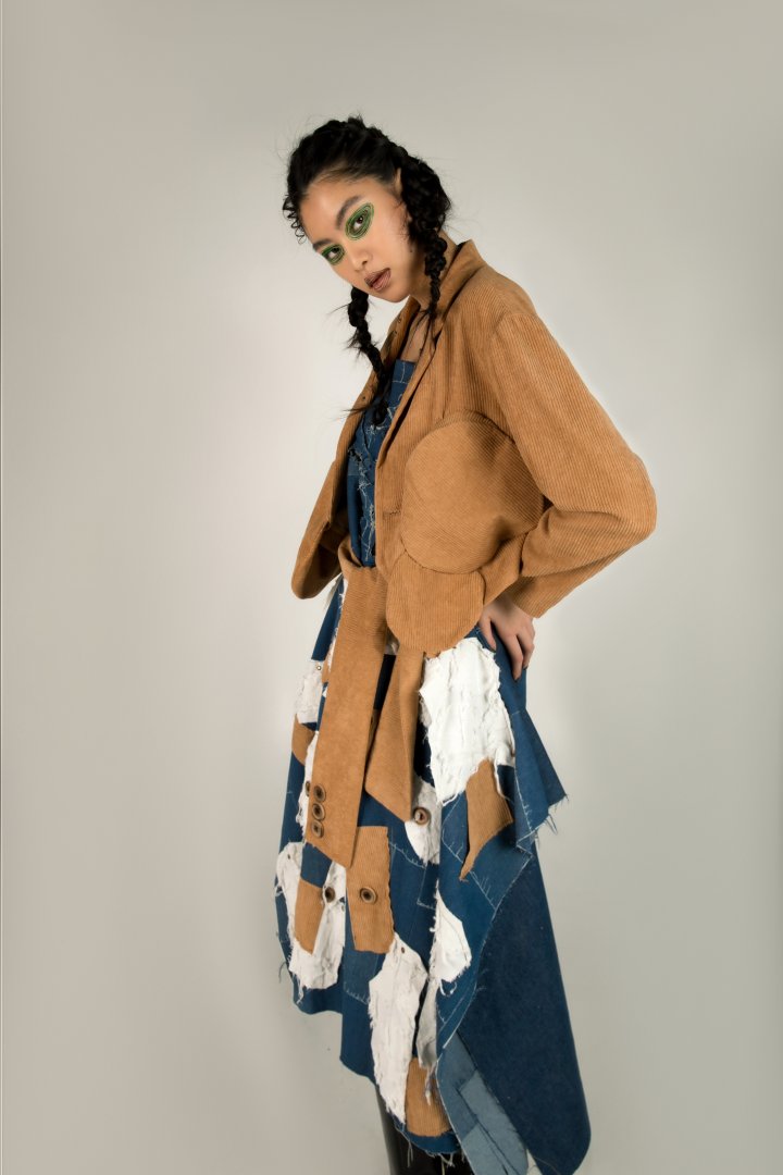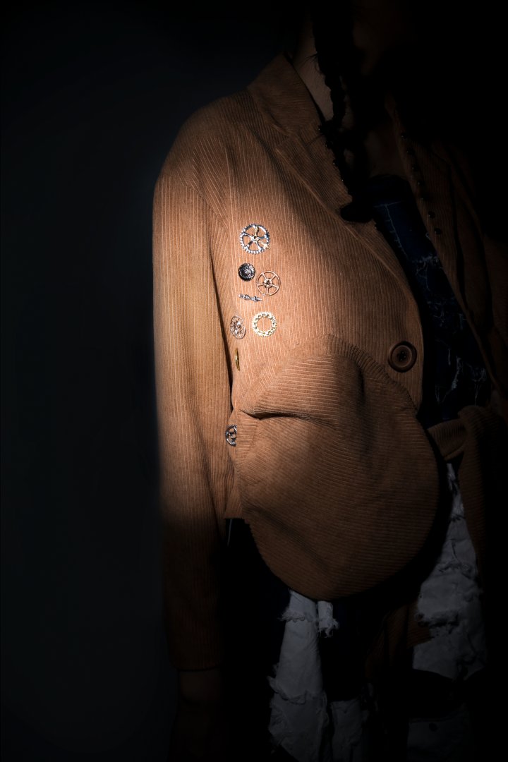 I focus on balancing the sense of design with wearability when designing garments, and I love finding inspiration from past fashion, which is reflected in my project "TIMES". The collection drew inspiration from the black-and-white film "Modern Times," which portrays the struggling working-class life in the United States during the Great Depression in dark humor. I researched typical Americans wearing in the 1930s, extracting some popular fashion element at the time, such as H line dress, as well as the neat and tidy suits of the capitalists in the movies and the tattered oil-stained aprons and denim jumpsuits of the working class. I also combined the screws, buttons, gears and other elements that appeared in the movie to make fabric manipulation samples. I slightly burned some gears, screws and buttons using a flame gun, trying to create a retro yet modern casual style.